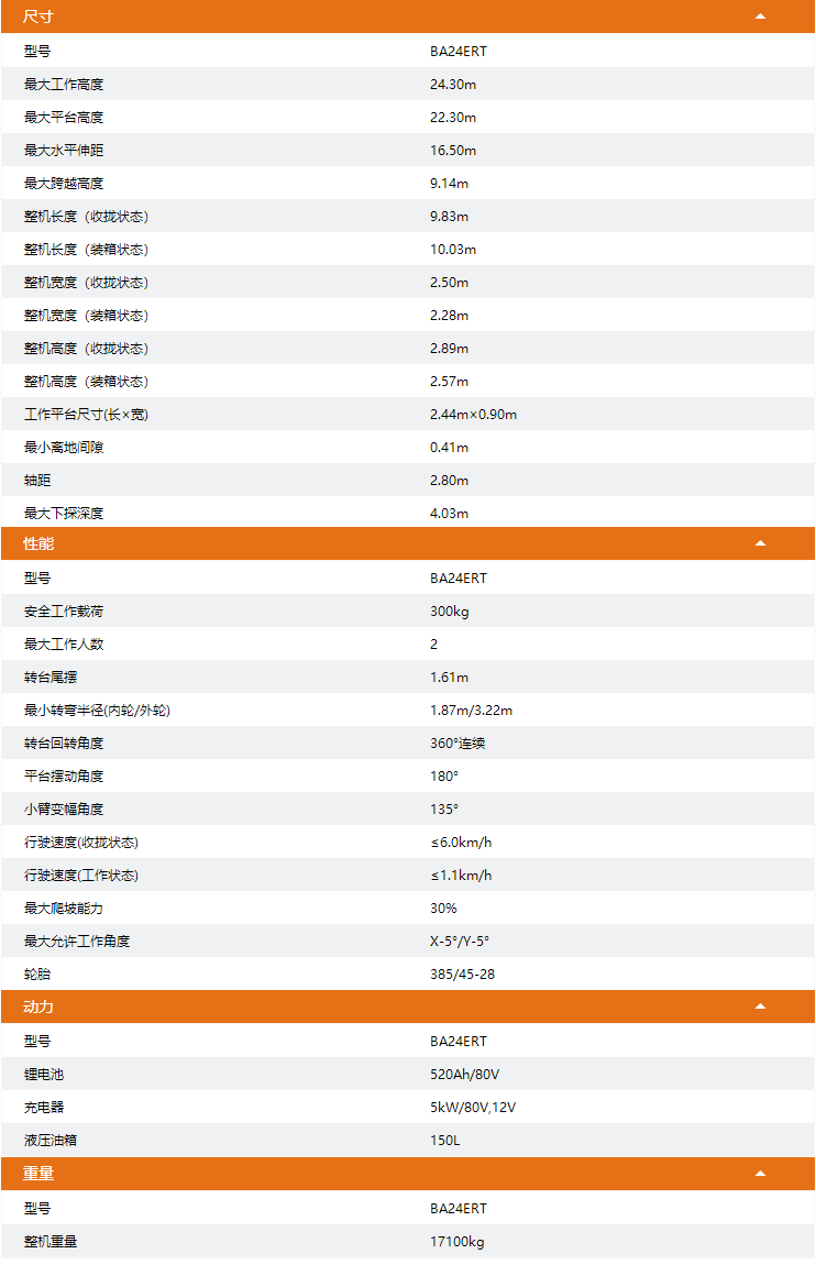 ● 工作高度:24.30m● 最大水平伸距:16.50m● 工作載荷:300kg