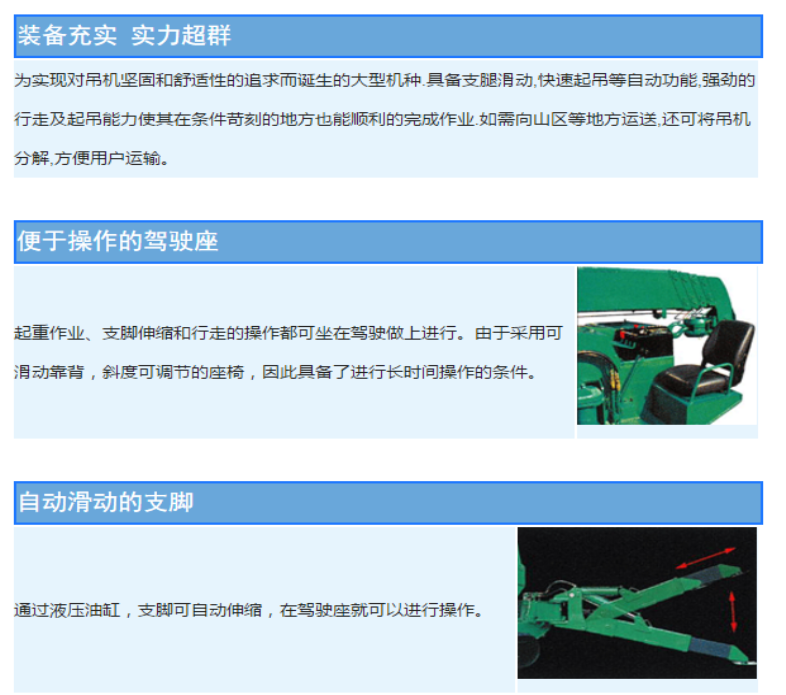 追求吊機的堅固性和安全舒適性而誕生的大型機種。具備支腿滑動,快速起吊等自動功能,強勁的行走及起吊能力使其在條件苛刻的地方也能順利的完成作業.如需向山區等地方運送,還可將吊機分解,方便用戶運輸。
